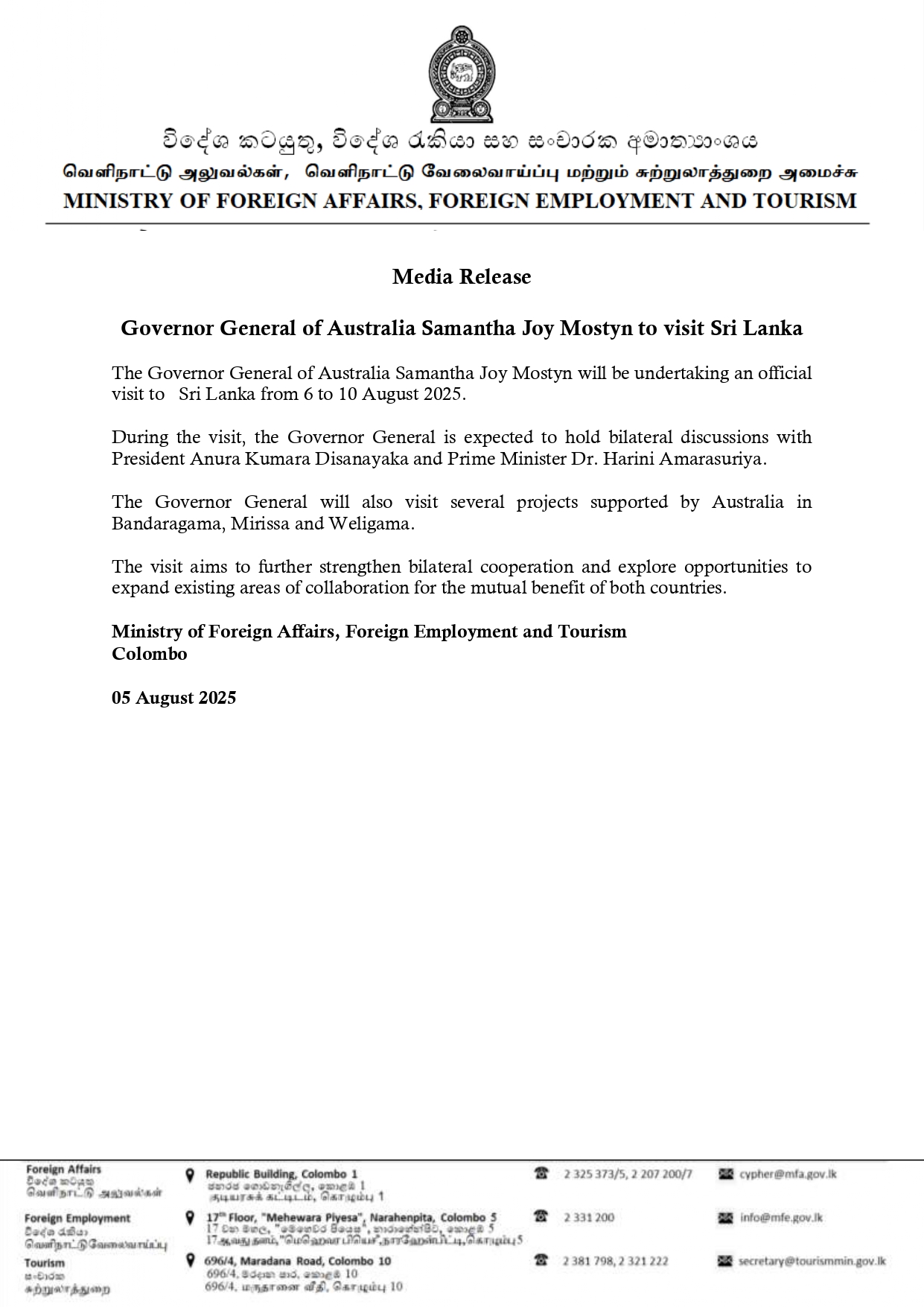 Governor General of Australia Samantha Joy Mostyn to visit Sri Lanka