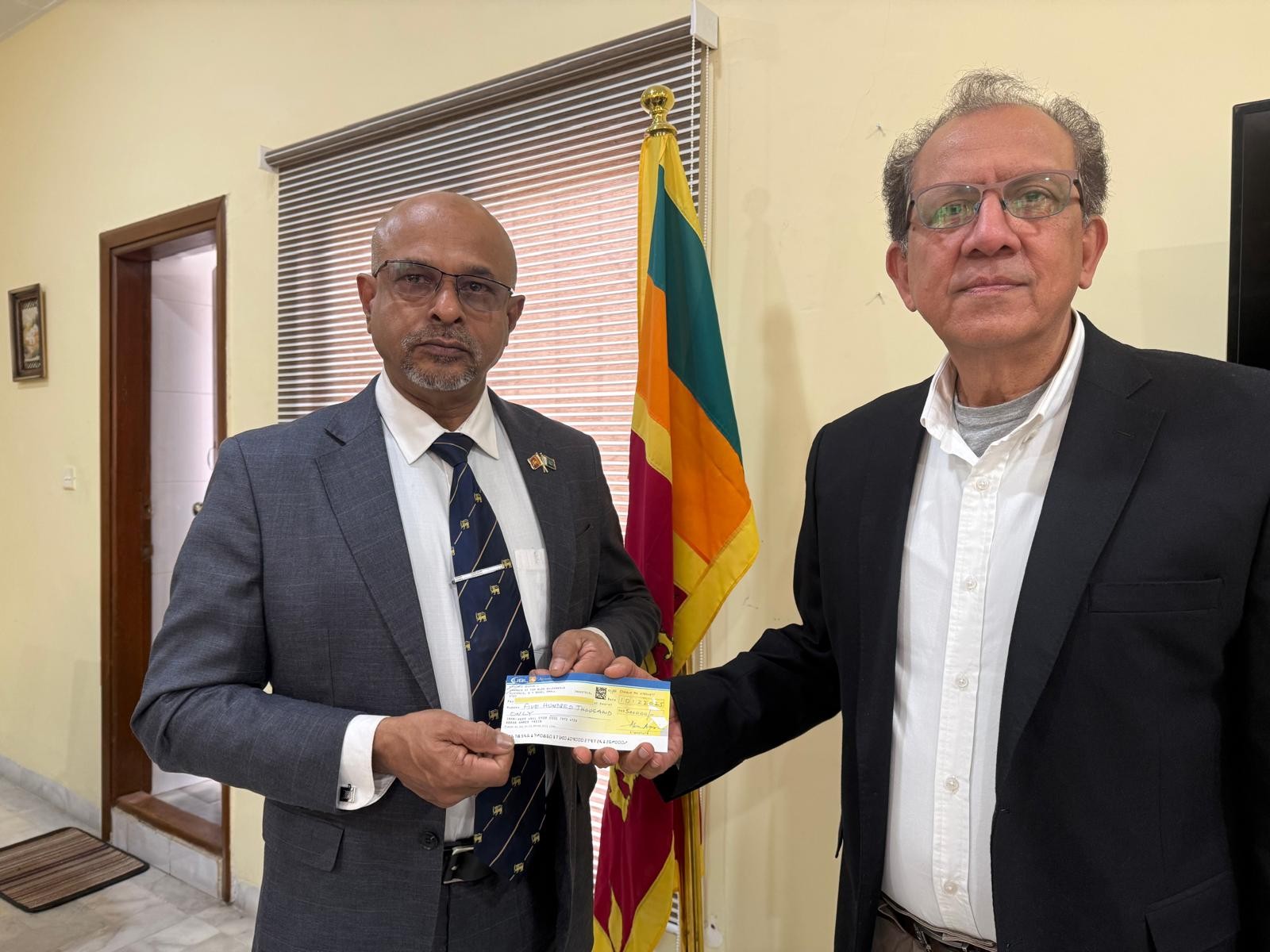 Mr. Abrar Ahmed, Managing Partner of M. H. Wali Muhammad & Co., visited the High Commission and handed over the cheque to Rear Admiral Fred Senevirathne, High Commissioner of Sri Lanka in Islamabad, on 09 December 2025.