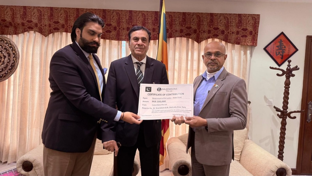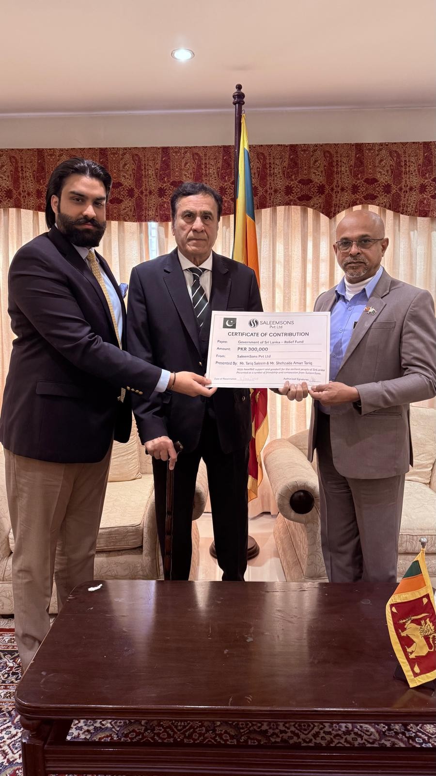 The High Commission of Sri Lanka in Islamabad received a cheque amounting to PKR 300,000 from Mr. Tariq Saleem, Founder of the Company, and Mr. Shehzada Aman Tariq, Managing Director, as a contribution to support the people of Sri Lanka affected by the recent cyclone and heavy rainfall. M/S SaleemSons Pvt. Ltd., Islamabad, is a long-standing family organisation engaged in construction, development, real estate services, and logistics in Pakistan.